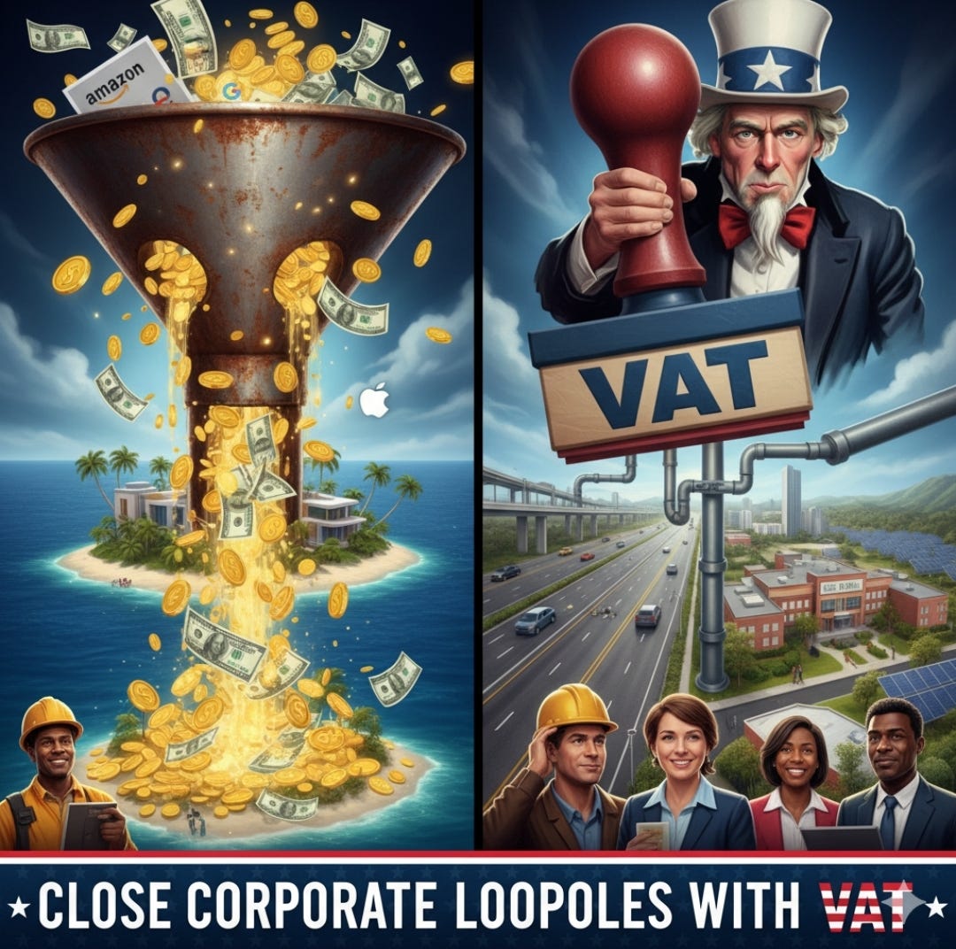 Clever metaphors and comparisons that are based in facts paying less in taxes is the absolute Cornerstone of the right wing and has been since the beginning of time but the problem is that when you get to a certain level of success the people that enforce tax law are not as smart as the ones that you can hire as forensic accountants and lawyers to help you avoid paying taxes. So i want to start with saying listen we all have to admit that if we're not worth hundreds of millions of dollars or CEO of the Fortune 500 company we have no idea what that tax game looks like and it's more something that's sold to us that we truly don't care about but I promise if you knew the truth you would care and you would say that's not left when we're right when that's just literally raping the country that allows you to do business here and we are the country we are the Americans so you can't do that. When you see that companies in Europe and Asia pay double in value-added tax than what we are proposing here, proposition by the way that puts $1,000 a month extra in everyone's pocket right off the bat before any other changes and that companies are still going to be posting profits in the high billions and the big difference will be that the profits are actually accurate and not things that you need to guess because of all the secret write-offs and offshore account. Building on taxes and fairness, Yang’s Value-Added Tax (VAT) tackles the elephant in the room: How corporations and the ultra-rich game the system, dodging billions while everyday workers foot the bill. Think of it like a toll on America’s economic highway—everyone who uses the road pays a small fee at each stop, with bigger trucks (corporations) naturally contributing more because they haul heavier loads. Currently used in 160 countries (every developed nation except the U.S.), a VAT is a 10% levy on goods and services—half the European average—applied at each supply-chain stage, making it nearly impossible to evade. Big tech like Amazon, Google, and others funnel hundreds of billions overseas, paying zero taxes despite profiting massively from American infrastructure, consumers, and innovation. Yang highlighted how income taxes are increasingly ineffective in an automated economy: “Take a company like Amazon—it can do tens of billions in business and pay no income tax while storing income overseas.” Corporations exploit deductions and loopholes that average Americans could never dream of—like writing off massive investments as if buying a house erased your entire year’s income, leaving them paying a fraction of what they should.