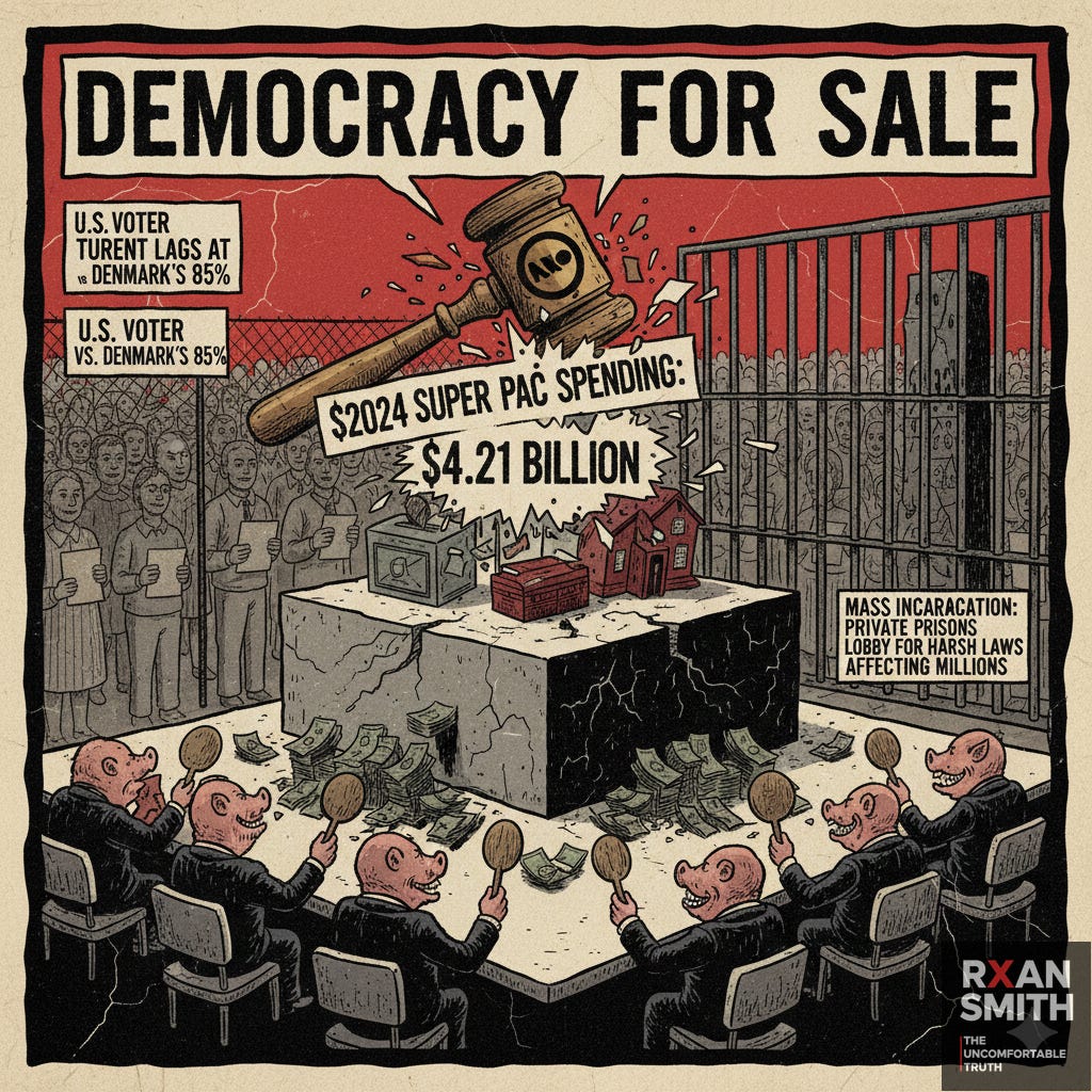 Campaign Finance as Legal Bribery: Citizens United enabled $14B in dark money impacts, eroding trust. Super PACs spent $4.21B in 2024. When a single donation exceeds lifetime earnings for most Americans, democratic responsiveness becomes a fiction.