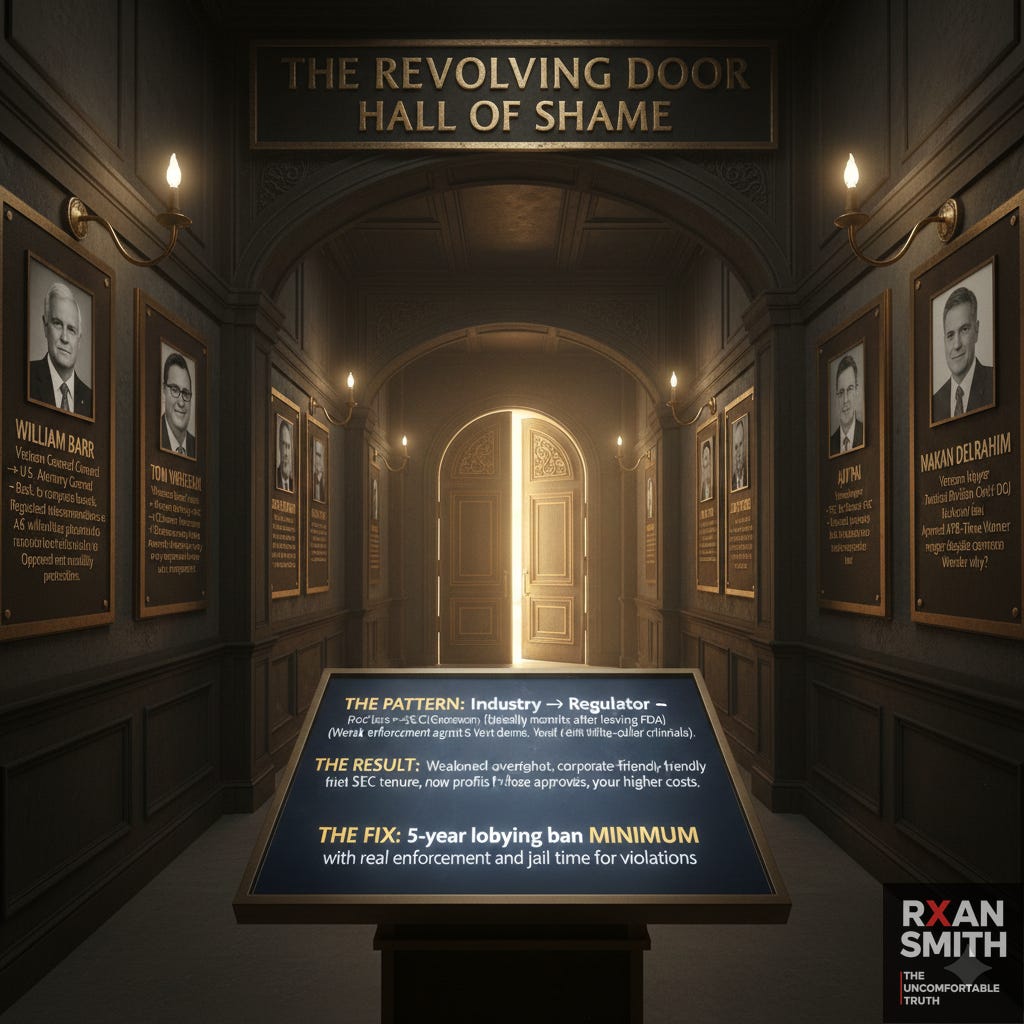 The revolving door isnât broken. Itâs working exactly as designedâjust not for you. Ban the revolving doors. Cap the cash floods. Overturn Citizens United. Create independent oversight with actual teeth. Criminalize regulatory capture with prison time for violators. Remind these suits that America isnât their private playgroundâitâs OUR country, and weâre taking it back.