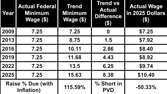 The most glaring omission? Wages. The federal minimum wage hasn’t budged since 2009. Historically, it’s been raised every 3.2 years. We’ve now missed five cycles. Obama raised it once, then stalled. Trump promised action, then pivoted. Biden didn’t touch it. If we’d followed the historical trend—averaging 4.39% annual growth including inflation and productivity—the minimum wage would be $15.63 today, not $7.25.