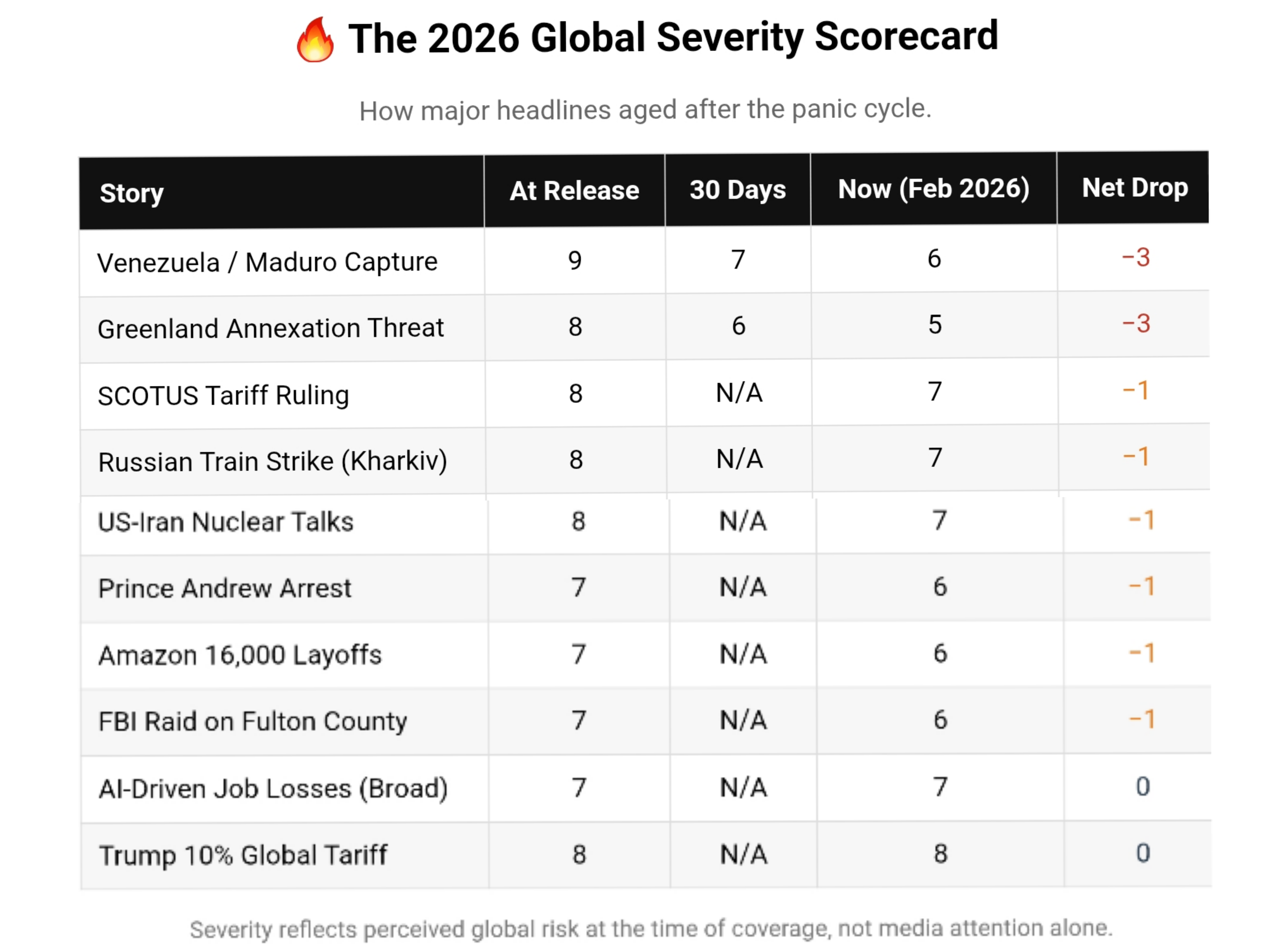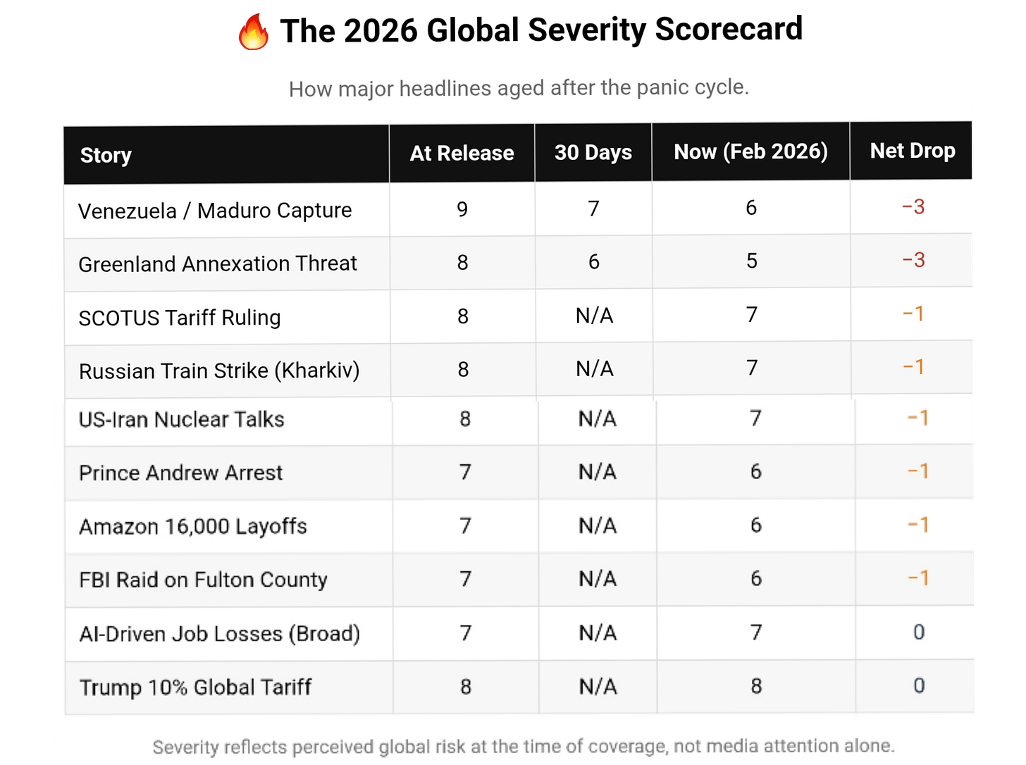 Look at the first seven weeks of 2026. Every single story that hit us with nine-alarm urgency is already sliding down the chart. Venezuela, Greenland, the whole circus — poof. Gone from the front page, gone from your group chat, gone from your brain. The new global tariff thing? Give it ten days. Same trajectory.