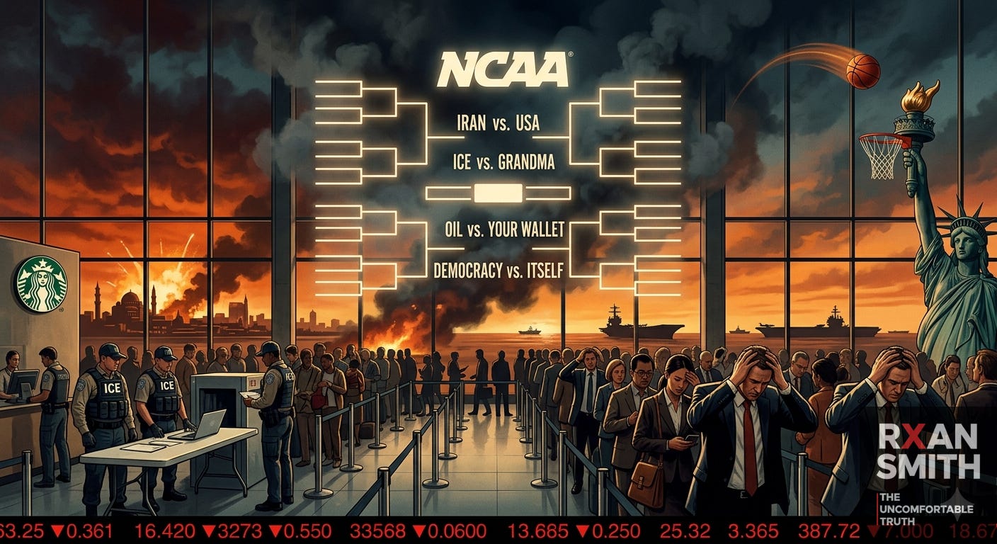 “The real Sweet 16 isn’t on CBS. It’s at LaGuardia, in the Strait of Hormuz, and in every American city where someone just checked their 401(k) and felt physically ill.”