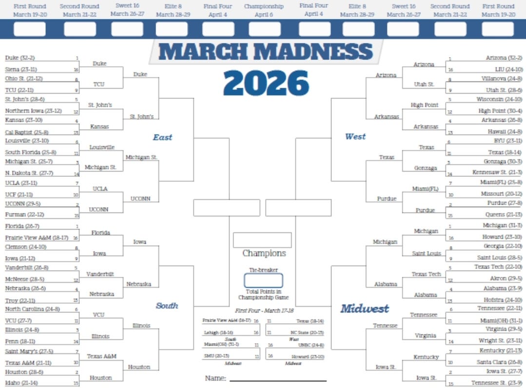 The national sedative arrives. Purdue vs. Texas at 7:10 p.m. on CBS. Nebraska vs. Iowa. Arizona vs. Arkansas. Houston vs. Illinois. Ten million Americans will briefly forget they are watching the empire collapse because an 11-seed Cinderella is about to punch a 2-seed in the mouth. St. John’s — yes, those St. John’s, Dylan Darling’s layup over Kansas with no time left — still dancing. Duke, still rolling on the other side of the bracket. Somewhere in the White House, a Diet Coke is cracked open and a bracket is quietly updated. It is the only thing left in America everyone agrees is real.