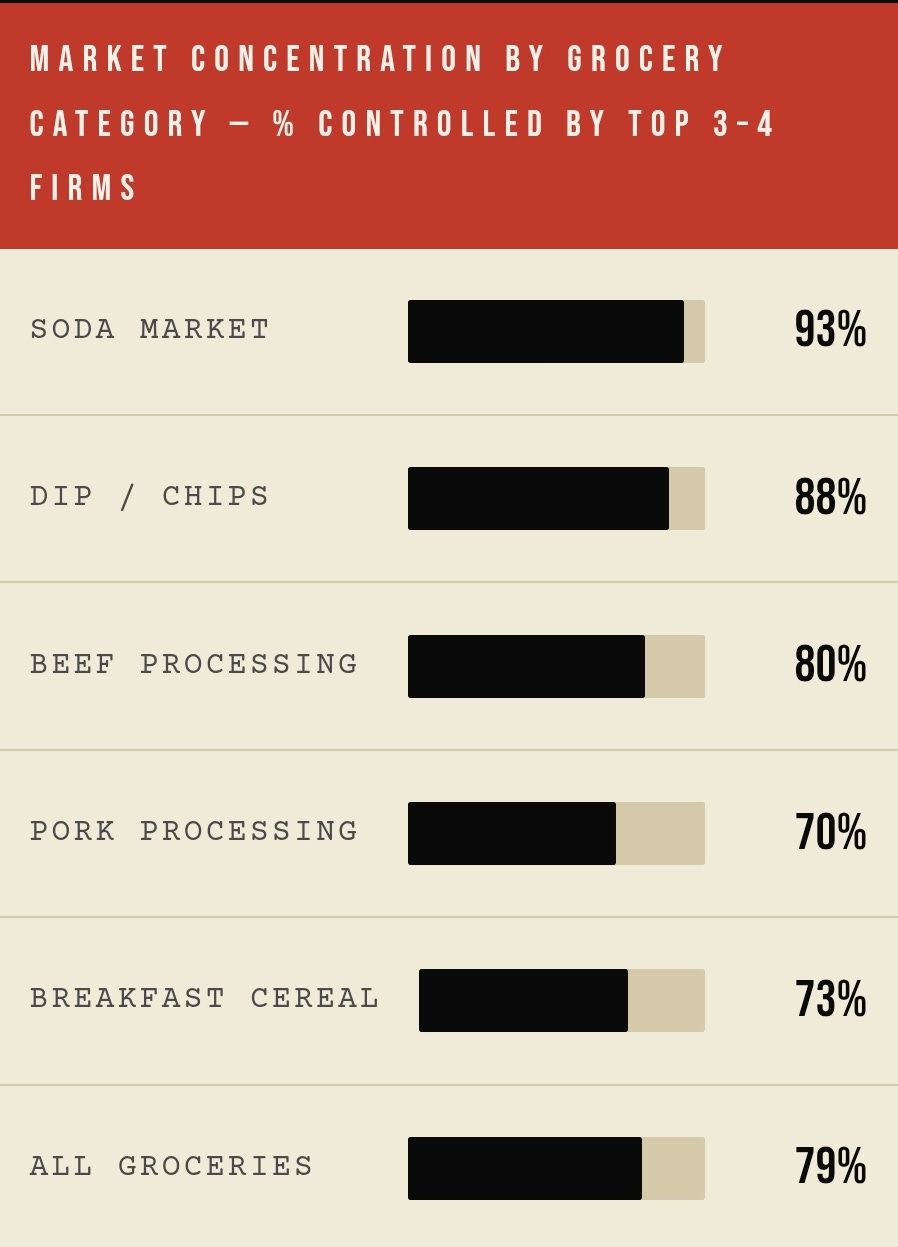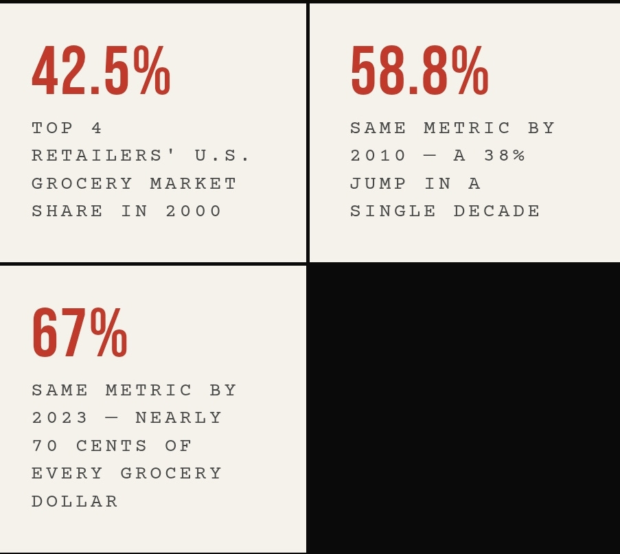 Nearly 70 cents of every grocery dollar now flows to four companies.