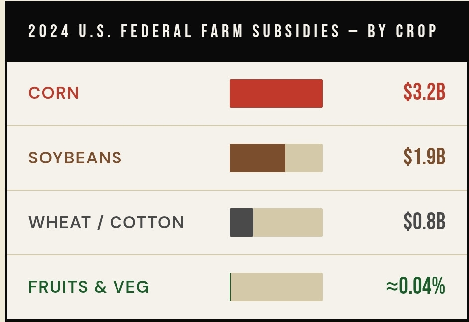 Corn receives $3.2B in 2024 federal support. Fruits and vegetables: 0.04% of total subsidies. This price signal makes processed food inputs artificially inexpensive relative to fresh alternatives.