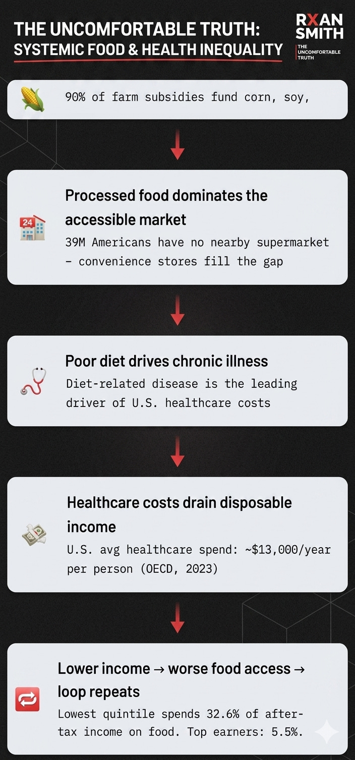 The United States does not have a food access problem. It has a profit architecture built on top of a food supply — and that architecture produces measurably predictable outcomes: cheap calorie inputs, expensive fresh food, geographic pricing stratification, and externalized health costs absorbed by the public.