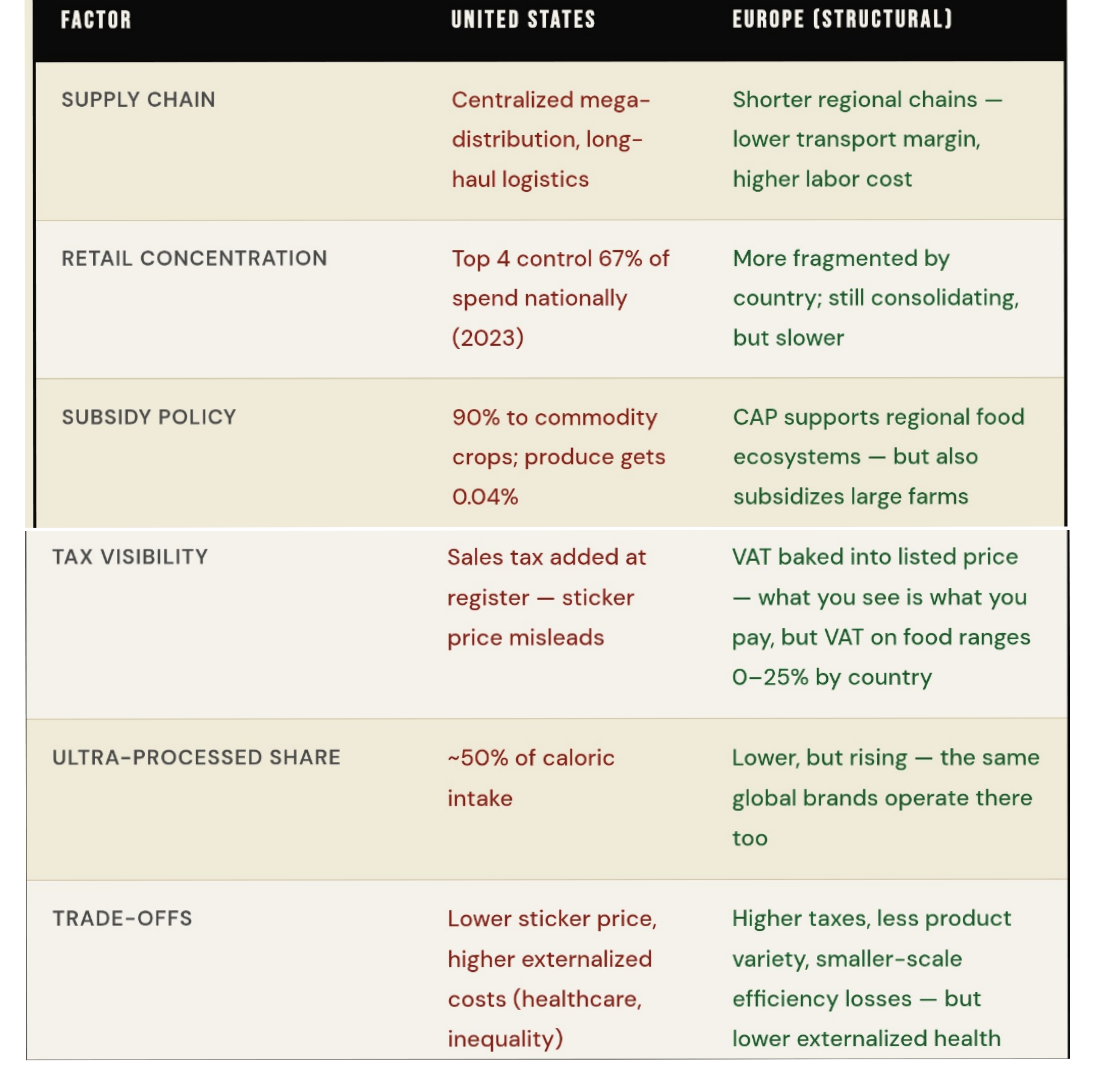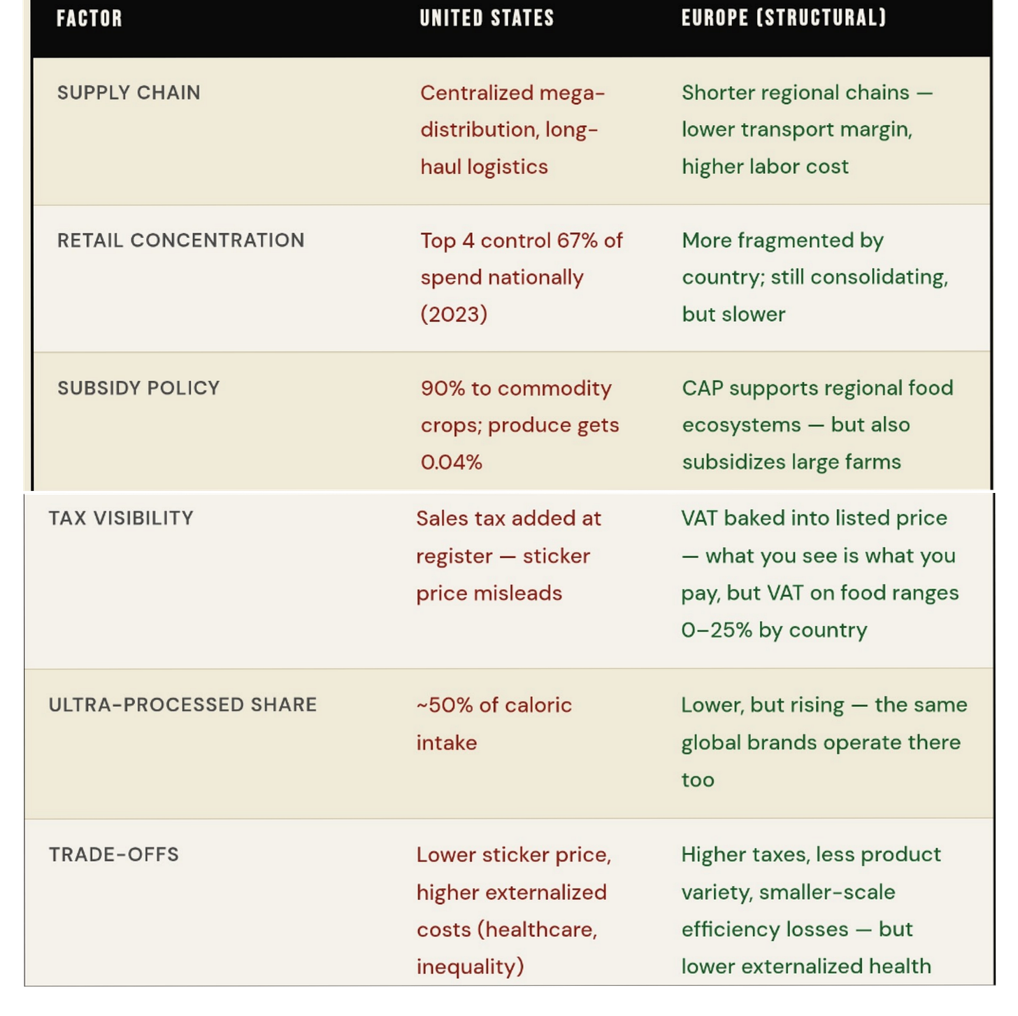 Europe is not a monolith. It’s 36 countries with a 61-point spread in grocery prices. The relevant comparison isn’t “U.S. vs. Europe” — it’s “U.S. system design vs. European system design.”
